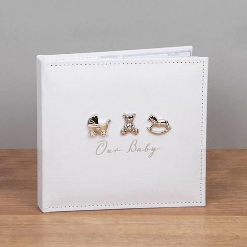 The white linen cover features silver foil titling and crystal encrysted silver plated teddy bear, pram and rocking horse icons. Inside is a personalisable front page for the new arrival's details complete with a beautiful gift box