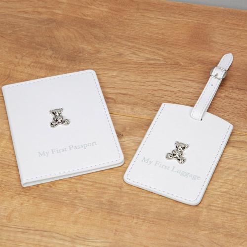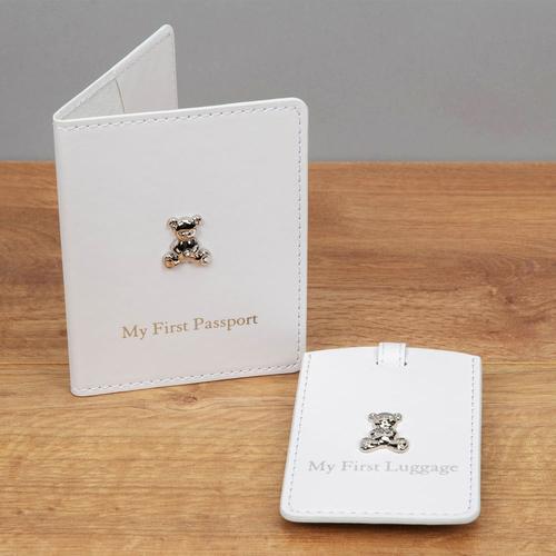 Prepare a new little explorer for their first adventure with this adorable white leatherette MY FIRST PASSPORT gift set.